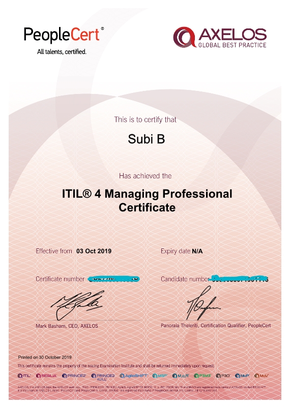 ITIL 4 Managing Professional Certificate December 30, 2020December 28, 2020 Proud to be part of the first batch in India to certify in ITIL version 4